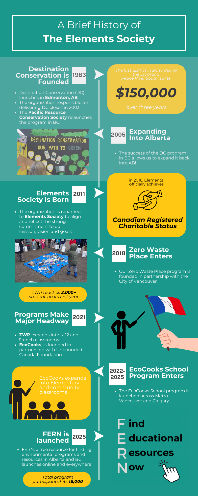 with the launch of Destination Conservation (DC) in Edmonton, our journey has been one of growth, adaptation, and impact. After the closure of the original DC organization in 2003, the program was relaunched in British Columbia in 2005 by the Pacific Resource Conservation Society, and in 2011, the success of the program led to expansion back into Alberta. In 2018, we became the Elements Society, a name that reflects our mission, vision, and goals, while continuing to grow our programs. Over the years, we’ve partnered with schools, districts, and communities to deliver innovative initiatives such as Zero Waste Place, EcoCooks, and FERN, reaching tens of thousands of students across BC and Alberta. Today, Elements Society is proud to be a Canadian registered charity, building on decades of experience to inspire environmental action and education for future generations.